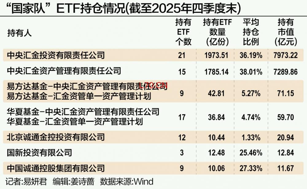 据Wind统计,截至2025年四季度末,中央汇金投资共持有21只ETF,合计持仓份额约为1974亿份,平均持仓比例为36.19%;合计持有ETF市值约7973亿元。