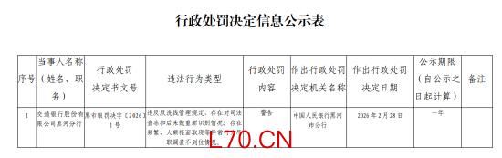交通银行黑河分行被警告:违反反洗钱管理规定,存在对司法查冻扣后未做重新识别情况等