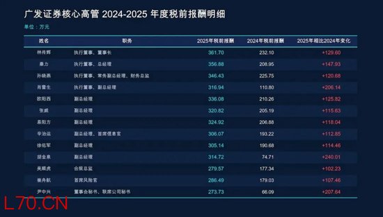 数据是最具说服力的证据。根据广发证券披露的2025年年度报告,公司董事长林传辉、总经理秦力等核心高管的税前报酬均出现了大幅上涨,涨幅普遍超过百分之五十。