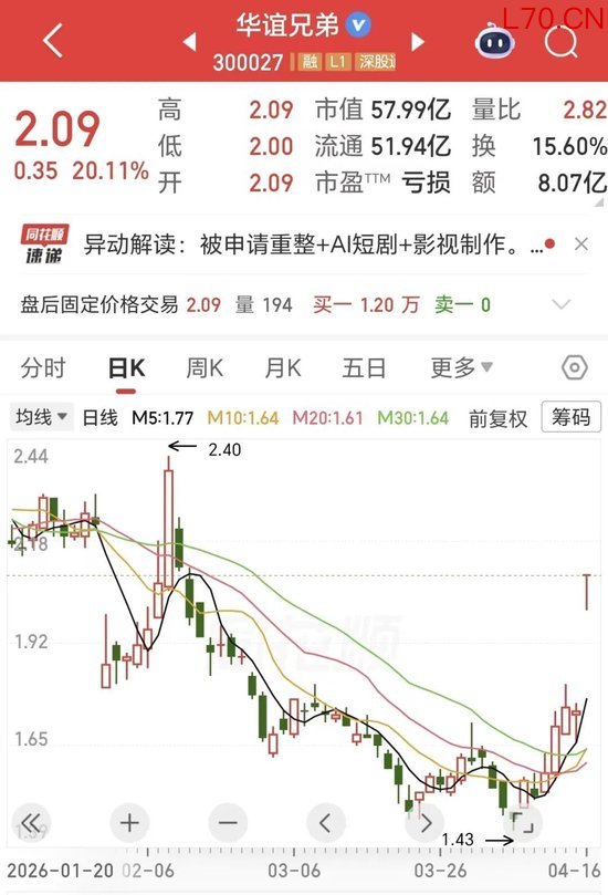 4月16日,华谊兄弟(300027.SZ)开盘后股价大幅拉升,盘中触及20%涨停板,最终封死涨停,报收2.09元,涨幅20.11%,总市值约58亿元。