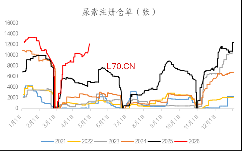 2026年4月27日,尿素仓单数量12100张,环比上个交易日+1642张。