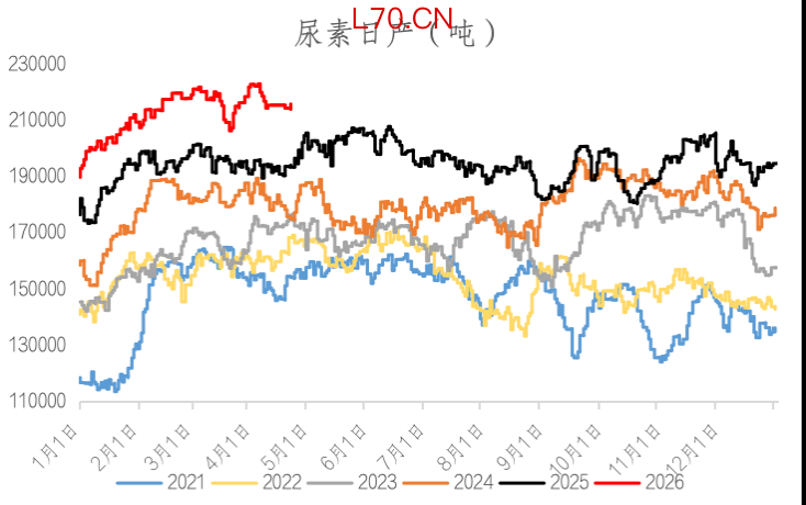 供应数据:据肥易通数据,2026年4月27日,全国尿素日产量22.2万吨,较昨日+0.22万吨,开工率88.51%。