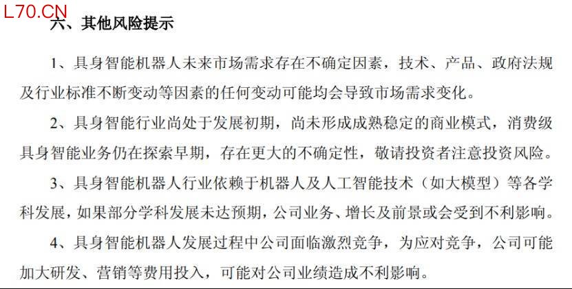 公司在公告中多次提示风险,称新产品研发到规模量产尚需一定周期和验证流程,研发能否成功、上市时间及市场推广情况均存在不确定性,且后续仍需大量投入,同时消费级具身智能市场尚处于产品导入期,存在诸多投资风险。