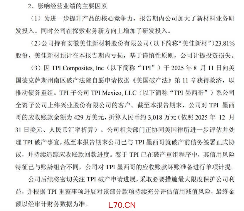 截至2025年末,上纬新材对TPI墨西哥的应收账款余额为429万美元,折合人民币约3018万元,因TPI处于破产重组程序中信用风险显著变化,公司对该笔应收账款单独计提坏账准备,目前正联合美国律师事务所评估处置该破产事项,并持续跟进回款。