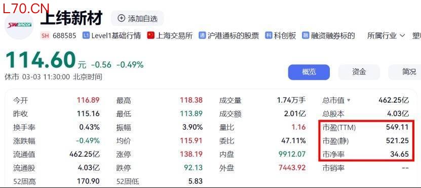 截至记者发稿时,公司的最新市盈(TTM)为549.11倍,静态市盈率为521.25倍,显著高于所处的化学原料和化学制品业市盈率水平。