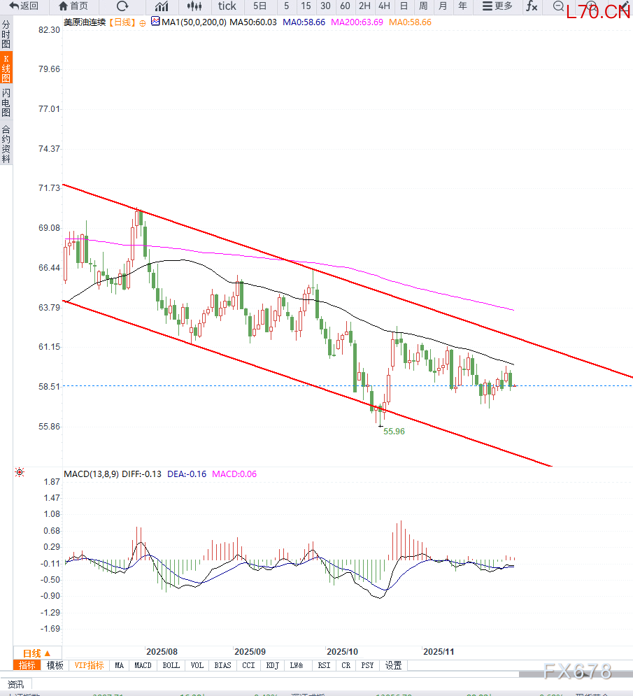 从WTI日线图走势来看,油价在跌破60美元关口后已明显跌穿短期均线支撑区,并触及近一个月震荡平台的下缘位置。近期连续阴线显示空头力量主导行情,MACD动能柱持续扩大在零轴下方,反映趋势延续弱势。
