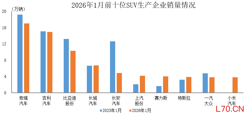 中汽协:1月销量排名前十位的SUV生产企业共销售73.4万辆