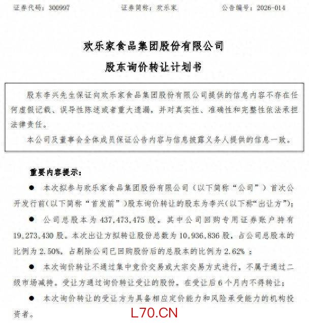 元股证券:ygzq.hk欢乐家2025年12月22日公告,股东豪兴投资、李兴和朱文湛拟询价转让公司股份,拟转让股份总数为1700万股,占公司总股本的比例为3.89%,占剔除公司已回购股份后的总股本的比例为4.07%。